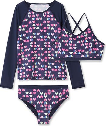Get a 3-for-1 deal with our 3-piece rash guard and bikini set. Dries quickly, resists chlorine, plus comes in rainbow leaves, stripes or dots. And for your peace of mind, it s all lined for modesty and made from UV-blocking, UPF 50 rated fabric.