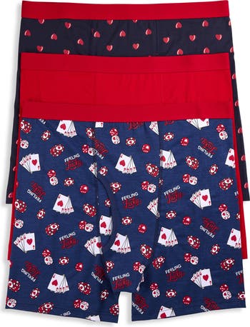 These comfortable boxer briefs from Harbor Bay are crafted in soft cotton with a touch of stretch for ease and the freedom to move without restriction. Made with HeiQ Smart Temp technology, they wick away moisture to keep you feeling cool and dry, feature an elasticized waistband and are tagless for an even more comfortable feel. Designed at DXL with precise proportions and a perfect Big and Tall fit, the comfort leg opening will not bind, chafe or ride up. The 3-pk set features a solid pair, ones with a fun heart print and a "lucky" pair with a deck of cards.