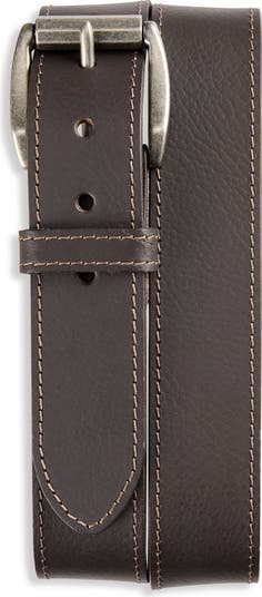 Give your look a rugged touch with this stylish belt, designed in rich leather and finished with a bold heavy-duty buckle. From jeans to chinos, it s the perfect complement for any pair.