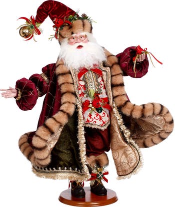 Mark Roberts’ Bird Lover Santa charms with a cozy, woodland vibe, dressed in rich festive fabrics and detailed trim that feel straight out of an enchanted forest. Cradled gently in his gloved hands, a bright red cardinal adds a warm pop of color and a sweet nod to nature’s winter beauty. The piece radiates playful holiday magic, blending Santa’s classic cheer with an elegant, collectible craftsmanship.