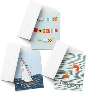- Card 1 front artwork: "Happy birthday shrimpy" shrimps