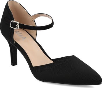 Knit composition puts a contemporary twist on this pointy-toe pump topped with a slim ankle strap.