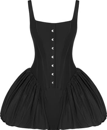 Step out in style with this black mini corset dress, designed with a low-waist sculpted silhouette and a voluminous balloon skirt for playful, doll-like charm. The structured corset has a straight neckline with wide, supportive straps that flatter every bust, while a front hook closure adds a classic touch and a lace-up back allows a fully customizable fit. Universally flattering, it sculpts the waist and adapts beautifully to all figures and heights, ensuring a polished, model-perfect look in real life.