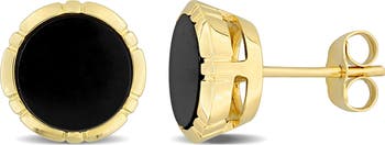 These lovely circle halo stud earrings are crafted in 14-karat yellow gold and showcase black onyx stones. These earrings are enhanced with a high polish finish.