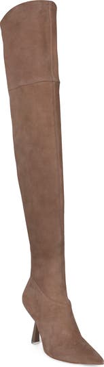 Step out in dramatic style with this pointy-toe boot in a sleek over-the-knee silhouette.
