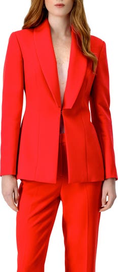 - Elegant red blazer featuring a shawl lapel and front clasp closure.
