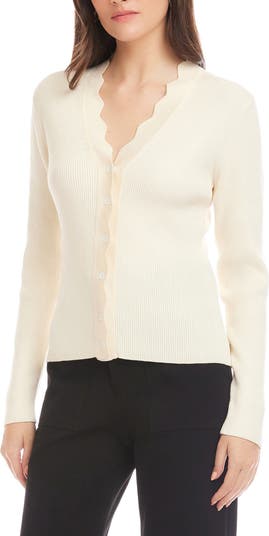 Allover ribbing enhances the close fit of this V-neck cardigan charmed by sweet scalloped trim.