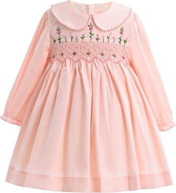 A delicate pastel dress with timeless charm, this long-sleeved piece features floral embroidery across a smocked bodice and a full flared skirt. The scalloped Peter Pan collar and puffed sleeves add a sweet, vintage-inspired finish. Embroidered smocking with pink and green floral detailing. Scalloped Peter Pan collar and gathered cuffs with contrast trim.