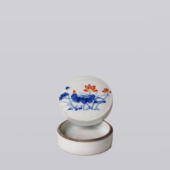 Cobalt Guild offers an assortment of blue and white porcelain vessels from the antiques markets of Jingdezhen, a town long distinguished by imperial patronage. This piece is a small paste ink box with lotus accented in red - symbolizing purity - and is part of our new collection paying homage to the designs of the 1920s, 5" D x 2 5/8" HWe suggest using for jewelry or other small secrets. . . perhaps for incense for your meditation practice?