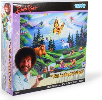 Put your skills to the test with this entertaining jigsaw puzzle inspired by the legendary artist Bob Ross! Bob Ross This is Happy Place 100 Piece Jigsaw Puzzle. Get creative with this challenging Bob Ross puzzle. Features high-quality, easy-fit puzzle Pieces. Completed puzzle measures 28 x 20 inches. Test your skills with this fun-filled activity.1000-piece jigsaw puzzle. Vibrant colors. Incredible detail. High quality. Clean edges. Relaxing and fun. No stress zone.