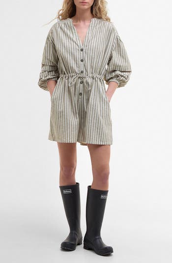 Subtle stripes enhance the laid-back vibes of this cotton and linen romper, while pintuck pleats at the sleeves add just the right amount of structure.