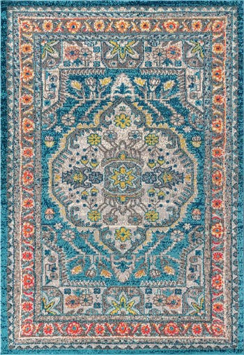 - Combining tones of aqua blue, yellow and orange, this rug is a versatile addition to any color scheme