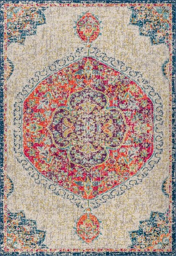 Boho chic, this rug features a Persian-inspired pattern on a beige background with bright contrasting accent colors including burnt orange, teal, garnet, and yellow. Gorgeous and soft, this rug features a comfortable pile with minimal shedding thanks to its power loomed construction. With the oversized scale of the center medallion and thin frame, this rug makes any small space look larger, a visual trick employed by designers for decades.