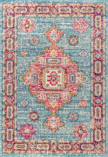 Whimsical in color, the traditional framed medallion design on this bohemian rug adds a tasteful splash of color to any style of décor. Whether for a high traffic space like a living room or dining room, or a private space like a bedroom or bathroom, the durability and style combine to create the perfect floor covering. In shades of navy, red, aqua, and ivory; this rug is a stunning accent for any space.