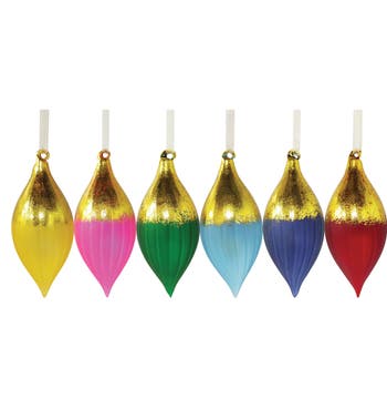 - This set of six decorative ornaments features a lightbulb-inspired silhouette with handpainted gold shimmer covering the upper portion, while each lower half displays a distinct vibrant color. The mixed hues create visual depth and a curated, boho-inspired holiday look.