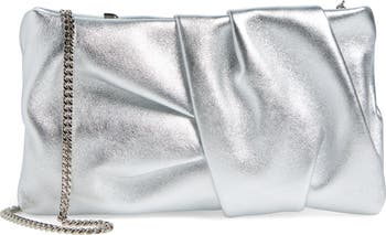 Artfully pleated and folded metallic leather showcases the label s craftsmanship in a glamorous clutch that can also be worn with a detachable chain strap.