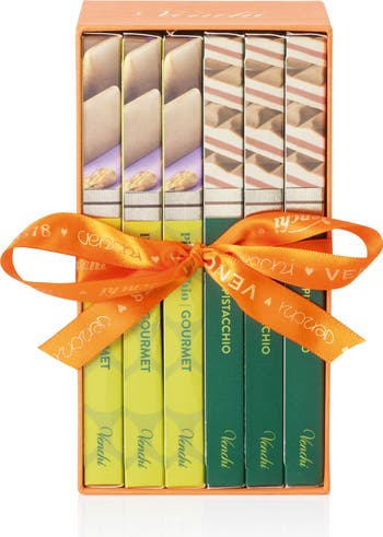 Made for pistachios lovers, this delicious boxed assortment includes three Cremino Pistachio bars and three Pistachio Gourmet bars. Cremino Pistachio features pistachio paste and a layer of white chocolate between two layers of milk chocolate. Pistachio Gourmet features lightly salted white chocolate and crunchy whole pistachios.