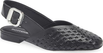 A woven leather vamp and polished buckle strap refine this slingback flat set on a low heel and a lightweight, flexible sole.