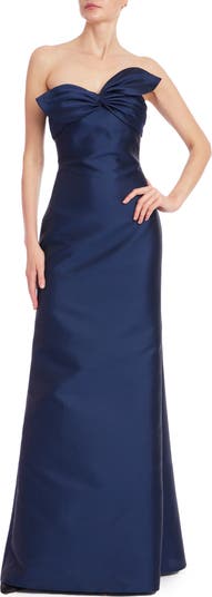 A bow-like detail brings elegant asymmetry to the strapless silhouette of a lustrous gown that will get glasses raised.