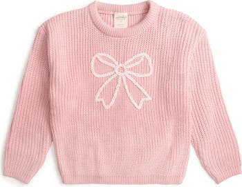This cozy pink knit sweater features a hand embroidered ivory bow on the front, adding a touch of sweetness to any little girl’s wardrobe. Perfect for keeping warm while looking adorable all season long.