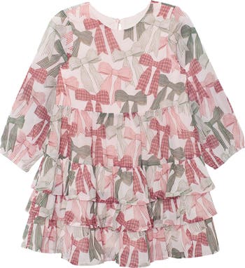 Playful and oh-so-adorable, the Bow-tiful Dress is perfect for little trendsetters. This long-sleeve, knee-length design features a tiered skirt adorned with ruffles, creating delightful volume and movement. Its standout bow pattern in soft pink and green, with striped and checkered accents, adds a touch of whimsy to any occasion. Crafted for comfort and style, this dress is a wardrobe must-have!