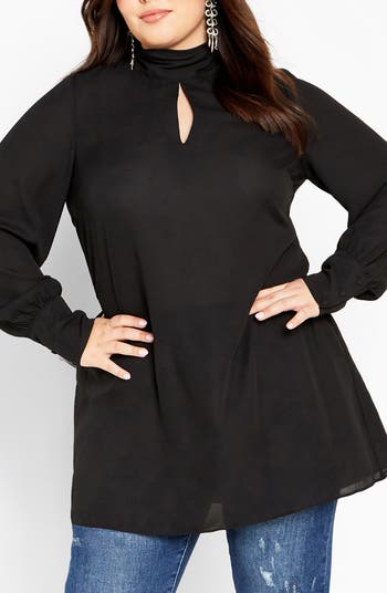 A polished tie dangles from the high mock neckline of this lightweight, longline top made with an airy keyhole cutout.