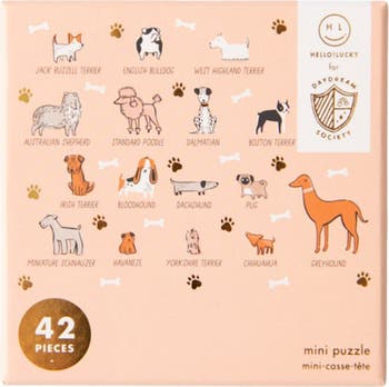 Introducing our favorite four legged friends - puzzle edition! Featuring 18 different breeds it is perfect for any dog lover! This puzzle is definitely best in show with its warm neutral color palette and gold foil elements. It s mini size makes it ideal for a quick gift, party favor or on the go activity.