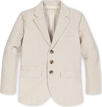 Our traditional seersucker blazer shows off his preppy style to perfection. Ours is cut in yarn-dyed organic cotton seersucker, featuring all the classic details: button front with faux horn buttons, notch collar, welt chest pocket, functional front flap pockets, and fully lined.