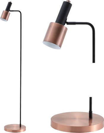 Boasting a refined mid-century-modern style inspired by vintage Hollywood decor, this unique task floor lamp connects a sleek curved pedestal with a shapely task shade. Compact to save space on busy workstations, its black and copper shade features a white interior to maximize the light. With a matching weighted base, the completed look is both elegant and modern.