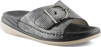A decorative buckle brings a polished touch to this cushy slide sandal grounded by a contoured, arch-supportive footbed and lightweight grip sole.