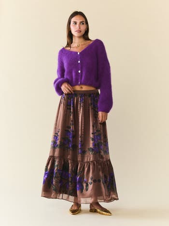 The Bri Skirt is all ease and quiet drama. Designed in 100% recycled fabric with a luminous finish, it moves fluidly with every step. The violet floral artwork watercolored by artist Larsen McDowell, blooms against a warm chocolate brown base, creating a striking play of color and texture. A soft elastic waistband and subtle tier at the hem bring just the right amount of volume, effortless, feminine, and made to catch the light.