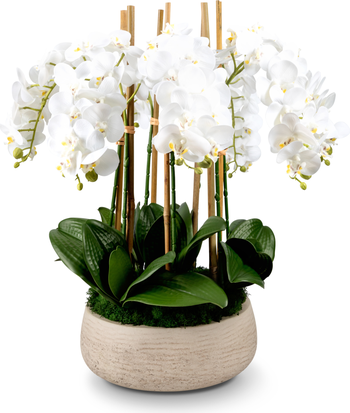 The Briar RealTouch Orchid Arrangement showcases seven petite RealTouch Orchids, complemented by four elegant Orchid leaves and rattan sticks, all nestled in a distressed cement vase with a refined curve. A perfect wow piece, it enhances any space with its sophisticated charm. This neutral, timeless arrangement makes an exceptional gift, sure to be cherished by all. A lasting luxury, timeless and unrivaled.