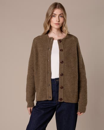 Crafted in Britain from undyed British wool, this moss stitch cardigan features a funnel neck, raglan sleeves, and a comfortable body fit. Finished with ribbed trims and natural corozo buttons, it offers warmth and texture.