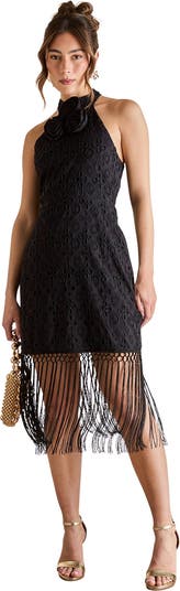 Make a statement at your next special occasion with this captivating broderie halter dress from Coast. The intricate hand-stitched detailing creates a textural masterpiece, whilst the dramatic fringe hem adds a contemporary twist to this classic silhouette. The halterneck design beautifully frames the décolletage, whilst the fitted shape creates a flattering profile. Complete your look with a woven clutch bag and a sleek updo to showcase the elegant neckline.
