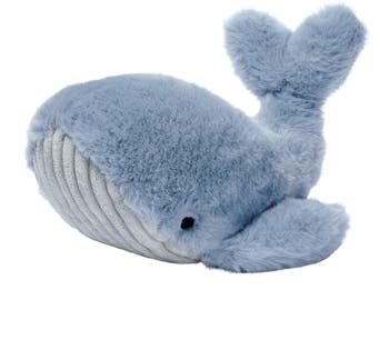 Your little one will love cuddling up with this adorable plush whale named Squirt. He is approximately 10” long and 7” wide and is made of a high pile super soft glacier blue minky fabric. His underbelly is made in a light gray textured ribbed velour and his eyes are embroidered. He is perfectly sized for tiny hugs.