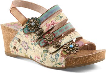 A chunky wedge and platform ground a playful strappy sandal featuring antique-style conchos, floral medallions and beautiful hand-painted leather.