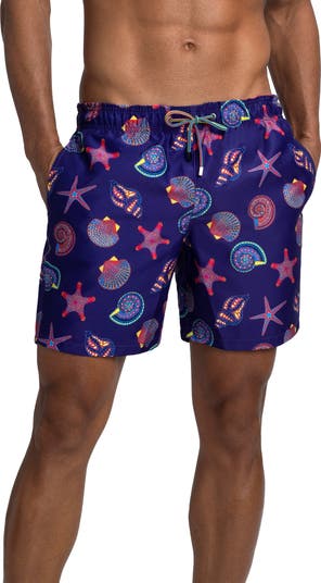 Scattered seashells pop in brilliant colors on swim trunks made of lightweight, quick-drying fabric with a roomy fit and plenty of pockets for essentials.