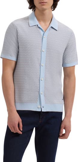 A honeycomb knit stitched from soft two-tone cotton yarns brings depth and dimension to your casual look when you build it around this short-sleeve cardigan.
