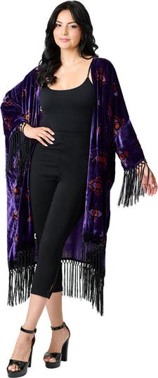 This sheer 1920s velvet masterpiece is adorned with intricate burnout designs that whisper secrets of a bygone era, while the playful fringe trim adds just the right touch of flair. Featuring its flattering quarter sleeves and fringe accent.