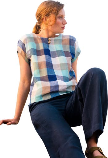 This stylish Linen Button Detail Top from Celtic Co. offers a chic green gingham pattern, perfect for casual summer outings.