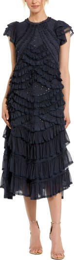 Sophisticated tweed midi dress with cap sleeves, pearl buttons, and flounced hem. A polished choice for work, events, or elegant daywear.