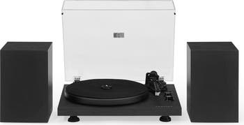 Includes: Turntable, full-range stereo speakers, clear dust cover.