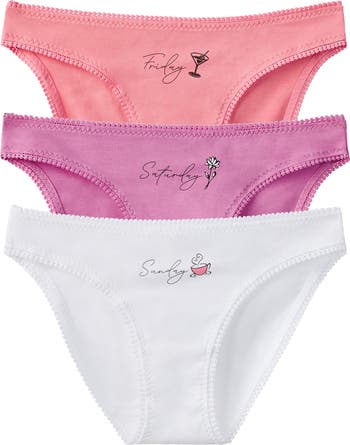 Fun and flirty day-of-the-week designs adorn this trio of bikinis made from ultrasoft and stretchy pima cotton for ultimate comfort.