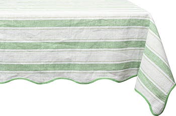 Set your table with the laid-back beachy vibe of this cotton-and-linen tablecloth that takes its influence from cushy lounge chairs at a seaside resort.