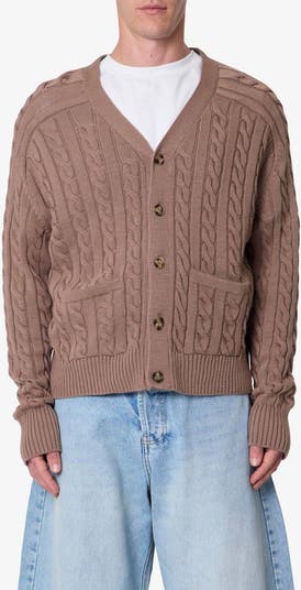Cables and ribs run parallel on a lightweight cardigan knit in a boxy fit and finished with handy patch pockets