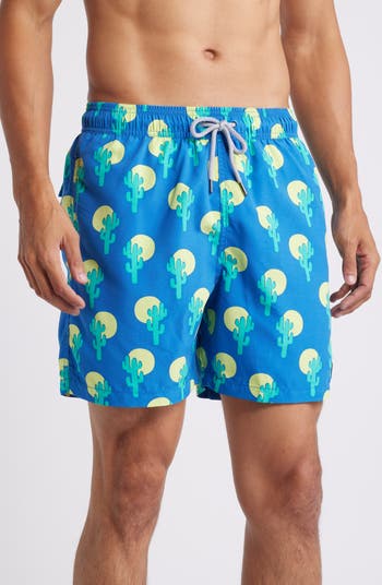 A cactus blocks the view of the relentless sunshine that patterns these classic swim trunks with built-in sun protection. They resist saltwater and chlorine making them exceptionally durable.