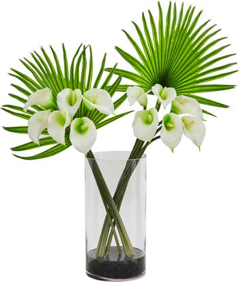Calla Lily and Fan Palm Artificial Arrangement in Cylinder Glass Vase
