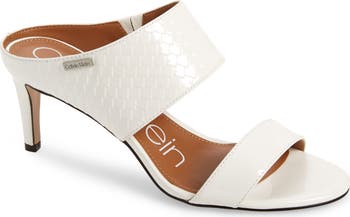 Svelte lines and a textured-leather finish refine the versatile appeal of a stylish sandal with a two-strap silhouette, balanced by a low, slender heel.
