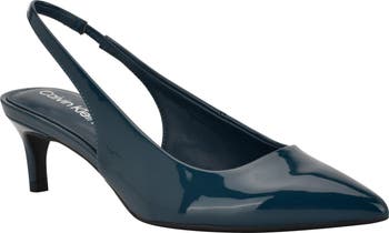 A pointy toe and tapered kitten heel balance a poised pump fitted with an elasticized slingback strap for easy wear.
