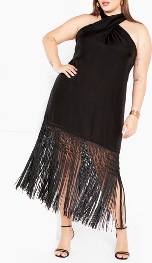 Shimmy onto the dance floor in this lightweight maxi dress fashioned with a crossover halter neck and a swingy fringe hem that sways with every step.